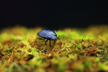 Macro low angle side view of borer beetle (Buprestis mariana) steal through broom moss on forest floor