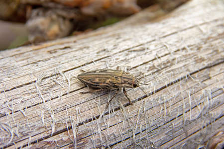 Flatheaded pine borer, chalcophora marina, on old gray wooden surface. Close up. Horizontal view . High quality photo
