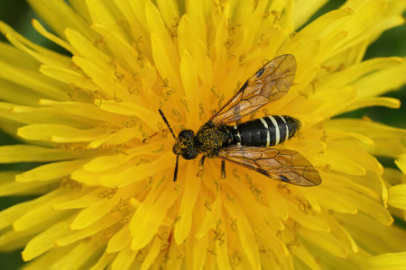 Natural closeup on a white striped sawfly species, Tenthredo koehleri in a yellow dandelion flower, Taraxacum officinale