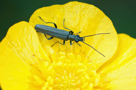 A closeup of the green Oedemera virescens beetle on meadown buttercup, Ranunculus acris