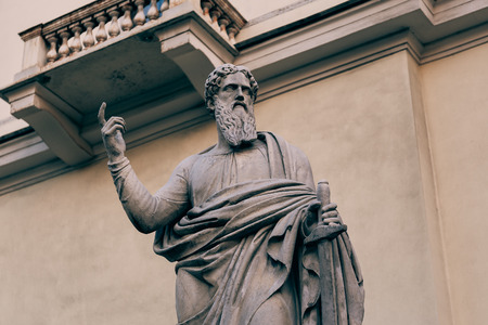 A statue of St. Paul backed by blue sky, Vatican City, Rome.