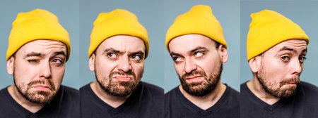 A man on a black background with different expressions of emotions. A collage of emotional states.