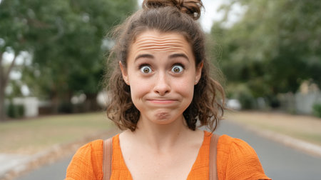 A surprised woman stands outdoors with wide eyes and a sheepish grin, capturing a lighthearted moment of reacting to a mistake, perfect for emotional imagery.