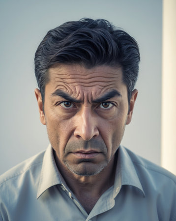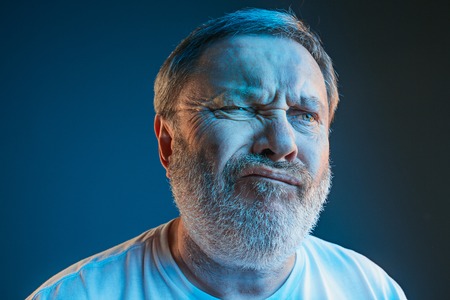 Close-up portrait of an angry man with a deeply furrowed brow and intense expression, glaring directly at the camera, set against a blue background.