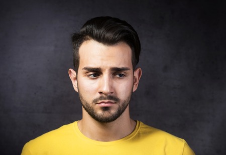 Portrait of a bearded guy in black, twenty-five years old, holds his fingers to his temple. On a gray background. The background to depression