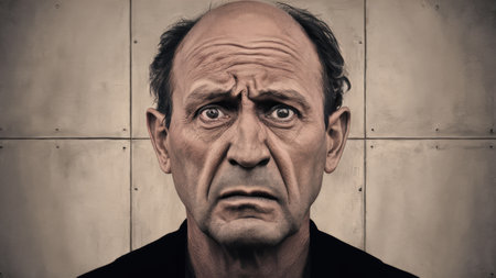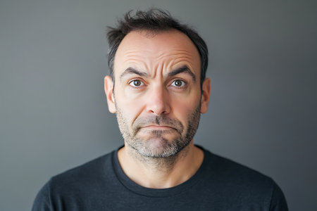 Man looking directly at camera with an expression of concern and confusion, head tilted, lips pursed in discomfort