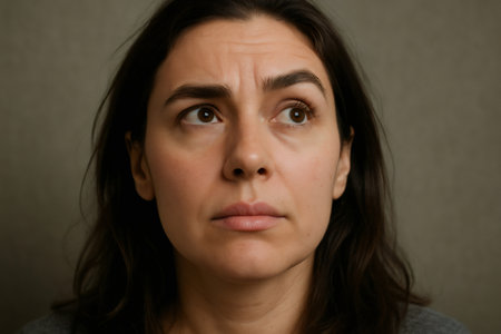 Portrait of a curious brunette woman looking up with wrinkles on her forehead, expressing interest and attention