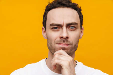 Pensive mid aged brunette casual man in t-shirt standing isolated over yellow background, close up