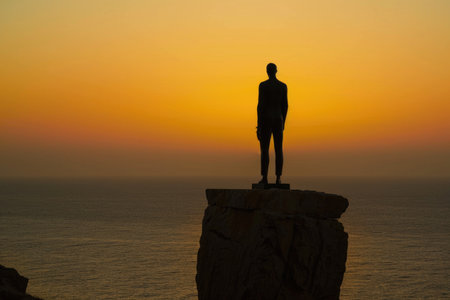 A lone figure stands on a cliff overlooking the vast ocean, silhouetted against the vibrant hues of a setting sun.