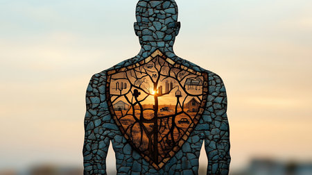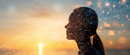 A human figure silhouette with sunset landscape and nature symbols AI generate