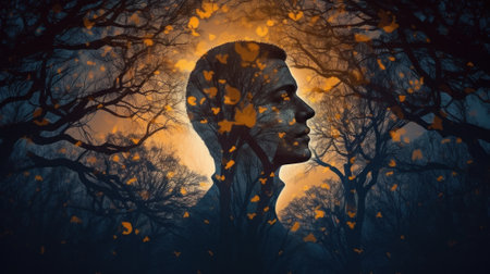 A man is depicted with a glowing outline, merging with colorful autumn trees. The tranquil outdoor atmosphere captures the essence of nature's beauty during fall.