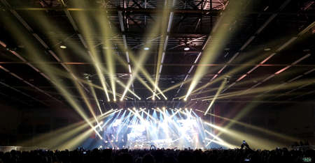 Crowd in front of a concert stage with bright rays of light