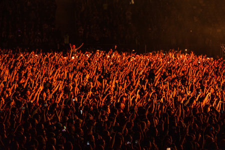 Warsaw, Poland, October 22, 2025 Large concert crowd in arena under blue lights with phone flashlights
