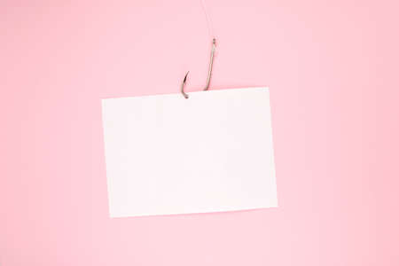 White paper sheet for text and fishing hook with fishing line on pink background. Design element, copy space.