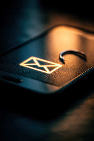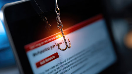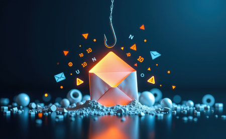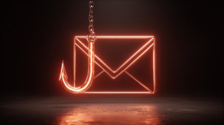 A bright, 3D hook is seen dangling from a digital envelope, symbolizing online phishing threats in a shadowy environment focused on cyber fraud.
