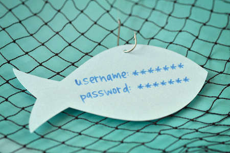 Username and password written on a paper note in the shape of a fish attached to a hook - Phishing and internet security concept