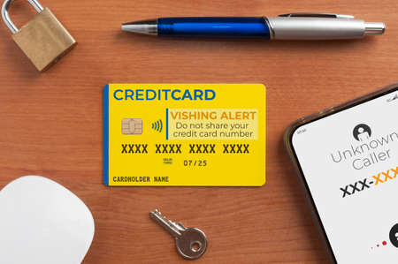 Vishing (voice phishing) concept, a credit card on a table next to a lock a key and a smartphone showing an unknower caller call, with a vishing alert and a reminder to not share credit card numbers