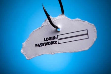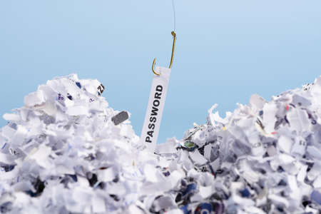 Password hooked on fishing hook pulled from pile of shredded documents on blue background