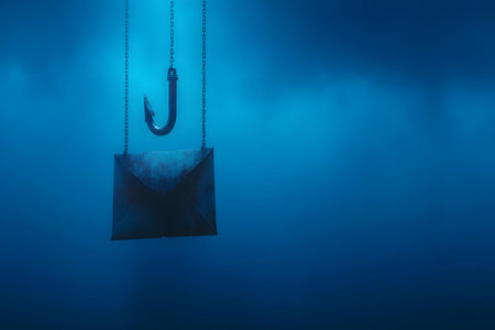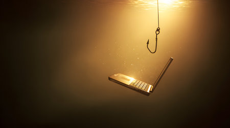 A large hook suspends an envelope underwater, symbolizing phishing attacks. the image's blue hues and eerie lighting create a sense of danger and urgency, ideal for cybersecurity awareness materials and campaigns. Generative AI