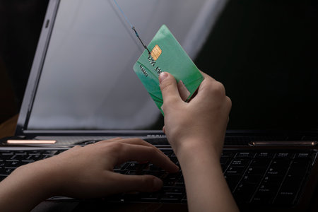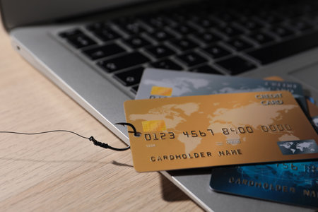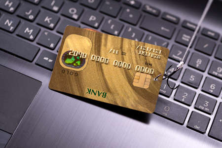 Internet fraud using computer technology, stealing money on the Internet, stealing credit card data. Hook hooked credit card on laptop keyboard background.