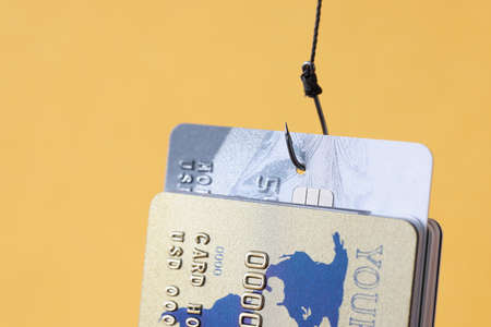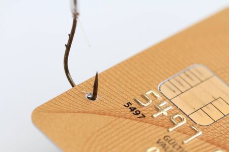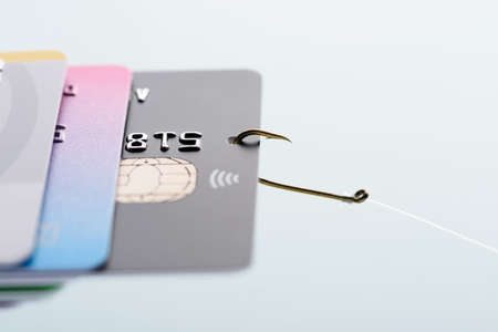 Credit card phishing scam concept. Credit card data theft, card hooked on fishing hook pulled from the stack.