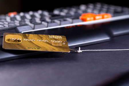 Internet fraud using computer technology, stealing money on the Internet, stealing credit card data. Hook hooked credit card on computer keyboard background.