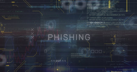 Image of phishing text, x symbol, binary codes, circuit board pattern over bokeh effect. Digitally generated, hologram, fraud, trick, crime, coding, machine learning and technology concept.