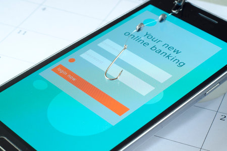 data phishing, hook on smartphone screen showing fictional online banking phishing website, selective focus,free copy space