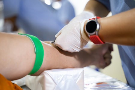 Insert a needle for blood collection close-up. Nurse in sterile gloves performs a venipuncture, collecting blood for diagnostic testing in a controlled clinical environment
