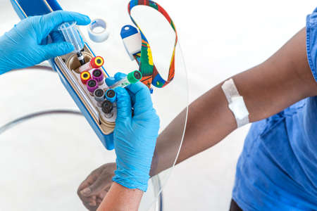 Close-up shot of healthcare worker wearing gloves ready to take a blood sample from arm vein with a vacutainer during venepuncture procedure