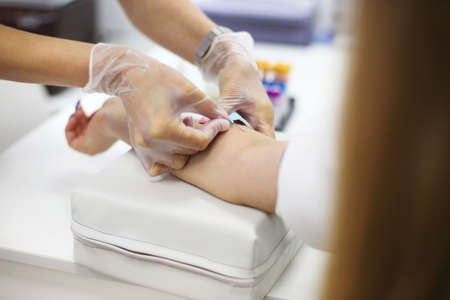 Female hands in transparent latex medical gloves are taking venous blood from a patient. Taking venous blood from a patient. Side view. Closeup.