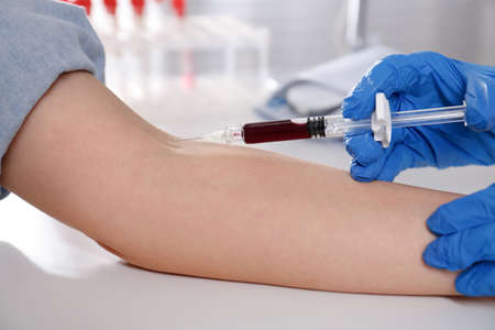Doctor drawing blood sample of patient with syringe in hospital, closeup