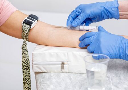 Injection during the blood collection. Diagnostic, healthcare, medical service
