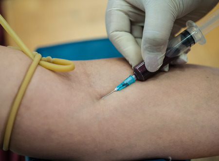 doctor injection needle selective focus syringe on arm to collect blood for test the health