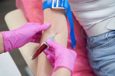 Close-up shot of doctor or nurse taking a blood sample from arm vein with a vacutainer. Venipuncture or venepuncture procedure