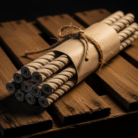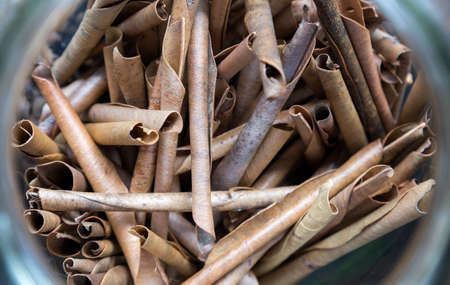 Rolled dry tobacco leaves, close up, macro