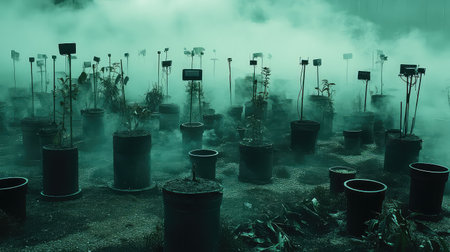 A hauntingly beautiful scene featuring potted plants shrouded in mist, creating a tranquil yet mysterious atmosphere perfect for artistic inspiration.