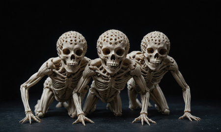Three skeletal figures crawl forward on a dark background