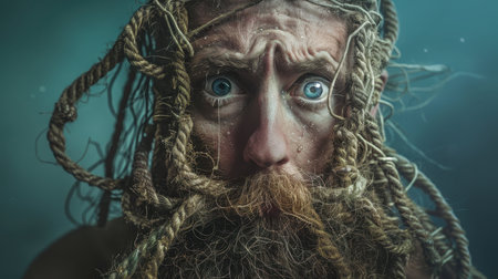close-up portrait of a man with a long beard and mustache, tied with ropes