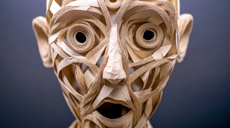 Sculpture of a surprised face intricately crafted from toilet paper rolls