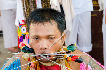 Phuket Vegetarian Festival. Shocking asian tradition - body piercing.