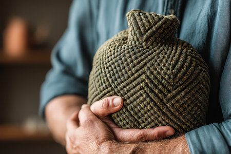 A person gently cradles a plush hot water bottle, showcasing its intricate texture in a warm, inviting indoor setting, emphasizing comfort and relaxation.