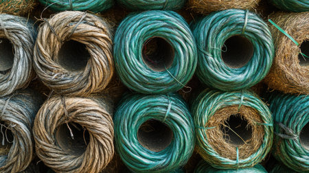 A rural farm scene with polyethylene rope rolls used for fencing or securing bales of hay.