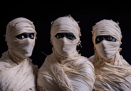 Three figures wrapped in bandages with dark eye makeup stand closely together in a dim environment, showcasing a traditional Halloween costume that captures attention with their eerie appearance.