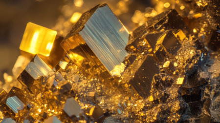 A stunning macro photograph captures the intricate, interlocking cubic forms of a raw pyrite specimen.