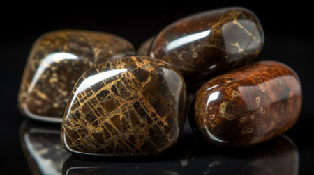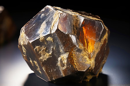 Bastnaesit is a rare precious natural geological stone eremite on a black background in low key. Fashionable jewelry elegant decoration. AI generated. Header banner mockup with space.