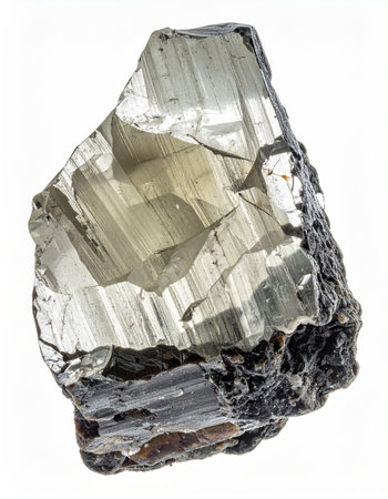 A single, unrefined specimen of a metallic mineral, showcasing its natural crystalline structure and brilliant, reflective luster. Isolated on a clean white background, this image highlights the raw beauty and industrial potential of geological resources, perfect for scientific, educational, or metallurgical themes.