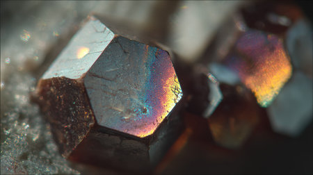 This captivating close-up image showcases colorful iridescent crystals with a hexagonal structure. The unique patterns and vibrant colors create a stunning visual experience.
