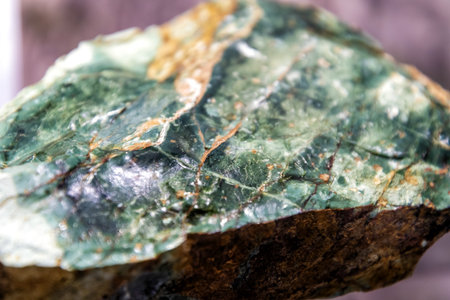A macro shot showcases the intricate details of a rough piece of Serpentine stone with its unique green hues and brown inclusions