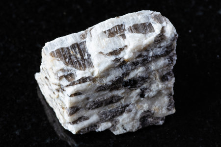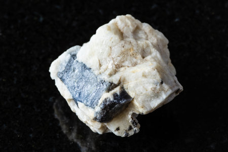 closeup of sample of natural mineral from geological collection - rough Granite Pegmatite rock on black granite background
